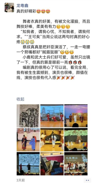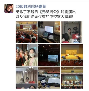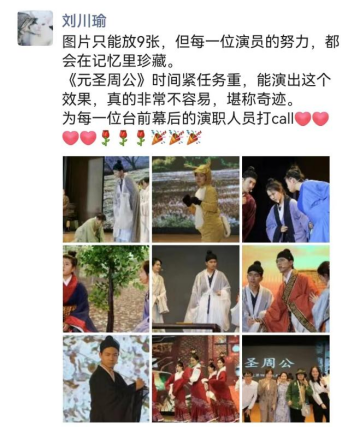 自《元圣周公》筹备以来,困难重重,本该在去年上演的戏剧受到各种因素的影响不断推迟,但在全体演职人员的共同努力下,一年来的辛勤汗水,终于在这一刻浇灌出成功之花,为师生们呈现出一场精彩的戏剧表演。
