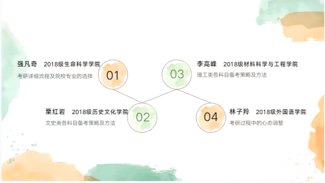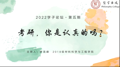 5月26日晚,“学子论坛”第五期——“考研,你是认真的吗?”通过腾讯会议拉开帷幕,本场论坛由2018级材料科学与工程学院李高峰发起,并邀请到外国语学院的林子羚、历史文化学院的栗红岩和生命科学学院的强凡奇三位特邀嘉宾。与会嘉宾分别围绕各自的考研经历与心得,系统分享了考研的基本流程、院校选择、各科目复习策略及心态调整等基本情况,帮助学弟学妹们认清考研形势,掌握考研方法,科学合理备考,熟知考研全貌。本次论坛由李高峰主持。