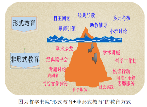 以创新教育模式为抓手,以学科交叉为导向,积极探索学科制书院模式下,以“哲学+”的视野去推动学科间的深度交叉融合和跨界整合,从育人理念、通识课程、培养模式、实践创新、文化传承这“五维向度”出发,形成独特的书院育人特色:一是凸显“哲学+”跨学科复合型人才培养理念;二是打造以经典阅读为核心的哲学通识教育核心课程群;三是全方位多层面贯彻全程全员导师制;四是秉承知行合一,强化实践育人平台;五是突出思想传承,践行文化育人。