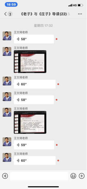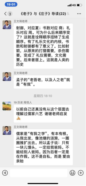 同样采取研讨方式的课程还有王文琦老师主讲的《<老子>与<庄子>导读》,该门课分两部分,课程前半段,王文琦老师通过语音授课的方式,为大家介绍了本课程的基本情况,带大家走进了老子和庄子。课程后半段,同学们在王老师的启发之下,积极思考,踊跃发言,因此可以说是直播和研讨相结合。对于老师的讲解,同学们很感兴趣,提问此起彼伏。难能可贵的是,在提出问题的同时,大家也有深入的思考。因此,王老师在悉心回答同学们提问的同时,也和大家进行了思想的交流与碰撞,可谓教学相长,互有进益。