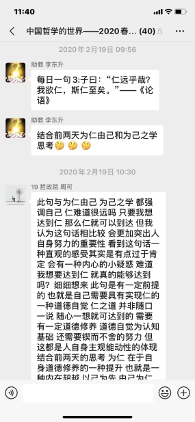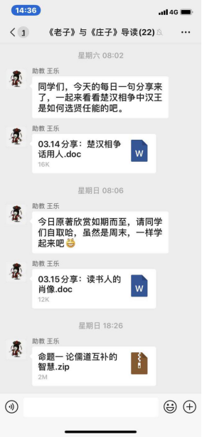 每日一句,别出心裁丰富第二课堂。除了线上授课外,书院多门课程还采取了别出心裁的“每日一句”经典研思活动,丰富学生第二课堂,既充分利用学生的碎片化时间,又极大提升学习自主性。所谓“每日一句”即由课程助教每周选取3-5句《论语》《孟子》《老子》等中国传统经典中的一句话,发至课程群中,每位学生结合自己的生活经验简谈对于经典的理解体悟。最先采取该形式的课程是《中国哲学的世界》,而后有《<老子>与<庄子>导读》的“每日分享”,类似的还有《基督宗教与西方文明》的“每日词条”,助教每天在课程群中提供和基督宗教文明相关的术语解释,一定程度上补充知识资源。坚持月余,学生们热情高涨、反响强烈,甚至发觉这样的每日哲思很有助于促进思想沟通,扩展其认知的广度和深度,提高学生的自主学习意愿和能力,具有很高的实践价值。