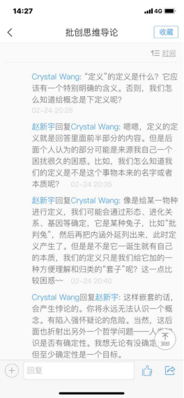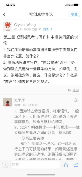 育人特色的一门课,王老师引用中山大学熊明辉教授团队开发的《批创思维导论》课程资源,在超星平台开放讨论区,布置讨论话题,如定义的内涵与外延、如何运用必要条件与充分条件这组概念来判定事物之间的关系等问题,同学们各抒己见,王老师认真地对几乎每位同学的看法给出了回应,部分同学在老师回应的基础上再“回应”,这种“对话”意义上真正的讨论,极大地加深大家对所学知识的掌握程度。除此之外,讨论还在QQ群内继续延展,就经验不可能与技术不可能之间的差别等问题进行激烈的争论,人文科学与自然科学触碰之后的相得益彰有所显露。