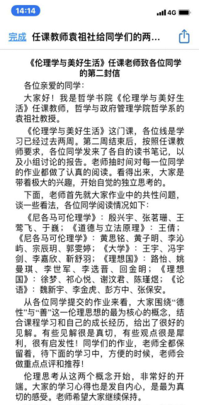 的典型授课方式,在线上教学的要求下,书院多门课程课程都直接采用研讨方式进行教学。袁祖社老师的《伦理与美好生活》课程利用超星平台上已有的中国人民大学龚群教授《西方伦理学思想史》的视频资源,学生们按照设定好的课程安排有序进行线上学习,袁老师也按照教学情况留下了相应的作业,同时由助教组织学生组建兴趣读书小组,进行互相的交流讨论,并产生自己的思考,每周他们会按时交一篇读书心得,把他们的心得与疑惑写成报告交给老师,这样能够激发学生们的阅读兴趣,也让老师更加深入的了解学生们,形成一个老师与学生之间的良性互动。
