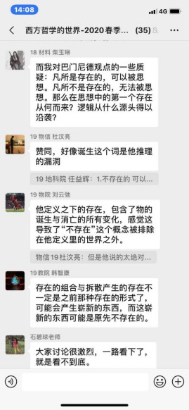 石碧球老师的《西方哲学的世界》一课,同样是以录课方式进行,其课堂的讨论氛围较之中哲课是有增无减。石老师注重培养学生的思维能力,他在录课音频中引领大家梳理了哲学的基本问题、可能旨趣、做哲学几种路向。课前已经完成观看任务的同学们成为了课堂的主角,他们出于对哲学的浓厚兴趣,从对课程的理解到自己疑惑的具体问题,在微信群中几分钟内会有十余名同学发问,石老师对其进行解答,助教作补充,其他同学也尝试互动解答,群内消息非常密集,几乎所有同学都参与讨论,如此热情高涨,使得一堂课有时甚至会延长至4-5个小时。这样的云端教学不仅没有拉开师生的距离,反而给大家提供更充分的交流空间。