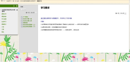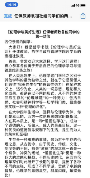 见屏如面,直播教学再现名师课堂。应现实需要,原本极不习惯线上教学的雷龙乾老师尝试突破限制,选用腾讯课堂的直播方式在线讲授《马克思哲学的世界》。这是一门和现实关联非常密切的学问,雷老师的课堂也因此十分注意让学科生活化,他从对现代化建设与马克思哲学之间的关系进行讲授,激发学生学习马克思哲学的热情,动员学生主动进行相关了解做思想准备,并布置了与当前形势相关的课后思考题,促进学生思考新冠肺炎疫情期间马克思哲学在其中是否有所体现等问题。这样的思考非常明显的展现出理论结合实际的马克思哲学的特色。学生们的思考也展现出作为一名公民对现实的强烈关怀,而学习哲学也为大家提供切入问题的不同角度,进而寻找解决问题的可能性。