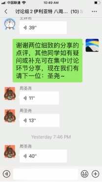 作为本学期的第一次讨论课,为了让同学们更加从容地在线分享及问题回顾,采用微信群逐条语音形式进行。讨论课共分三个环节,从个人汇报、自由讨论到一句话小结,同学们准时上线,积极参与,热闹有序。