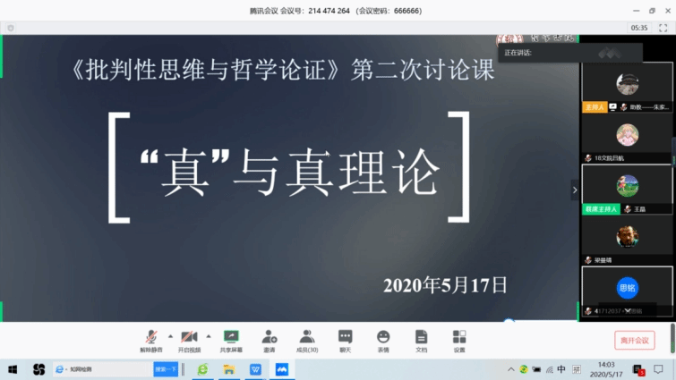 哲学系王晶老师负责讲授。在疫情防控的收尾阶段,按照校院“如无必要不返校”的要求,在书院的领导下,《批判性思维与哲学论证》这门课程继续有条不紊地开展着线上教学工作,照常推进教学计划。根据课程讲授计划安排,本课程的第二次讨论课于5月17日(星期日)在腾讯会议上成功举办,本次讨论课的主题为“‘真’与真理论”,长安与雁塔两个校区班的各年级、各专业的选课同学全员参加。