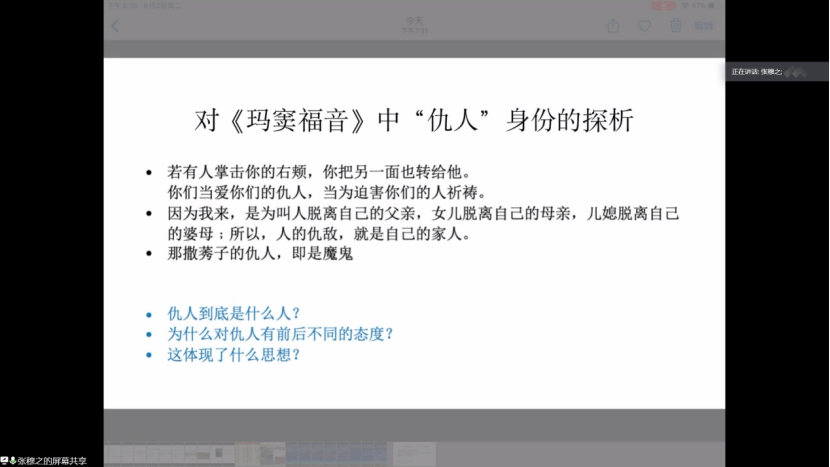 以“整体研究·意象研究·寓意解读·文本梳理”为主题的第四组讨论于6月2日晚顺利举行。讨论开始前,宗老师照例对主题文本的大致情况作了介绍,主要涉及《旧约》和《新约》的关联以及本次所讨论的文本的重要意义。她特别指出,基督信仰的价值观念在历史上改变了人们对待生命和弱势群体的态度,体现了其以“爱”的原则为核心的特质。应当尽量用科学的、客观的态度去解读和评价《圣经》,可以予以批驳,但即便如此,也应以敬畏的心态去对待。