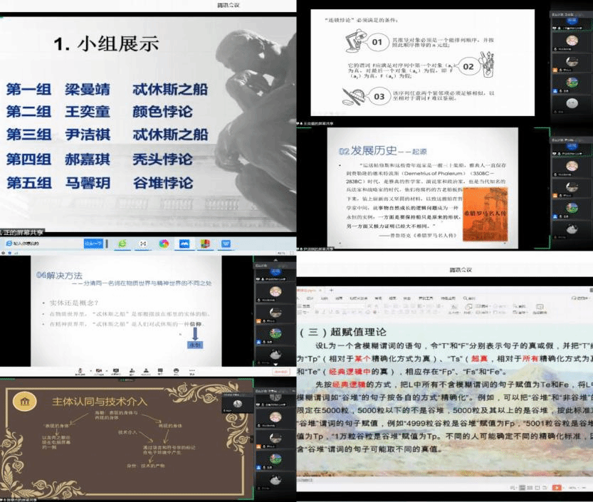 经过精心筹备,第三次讨论课于6月14日在腾讯会议上顺利进行。本次讨论按照计划分为两个部分,首先是各小组派代表轮流对数周以来阅读、总结、讨论的成果进行展示。各小组都对各自所感兴趣的连锁悖论进行了精彩的解读,并尝试从不同角度出发解决悖论。