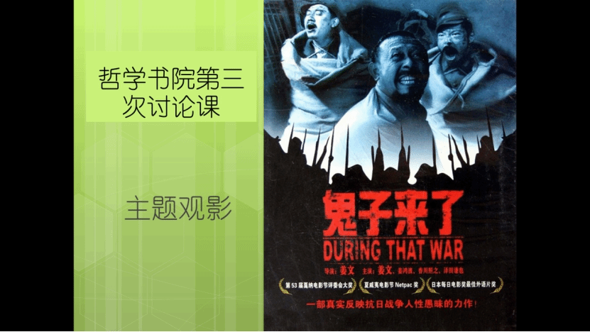 6月27日晚,《伦理与美好生活》利用七点到九点的时间组织进行了最后一次讨论课,也是本学期的最后一次活动。本次讨论课采用的是主题观影形式,要求同学们首先观看姜文的电影《鬼子来了》,然后围绕电影发表自己的感想与思考。