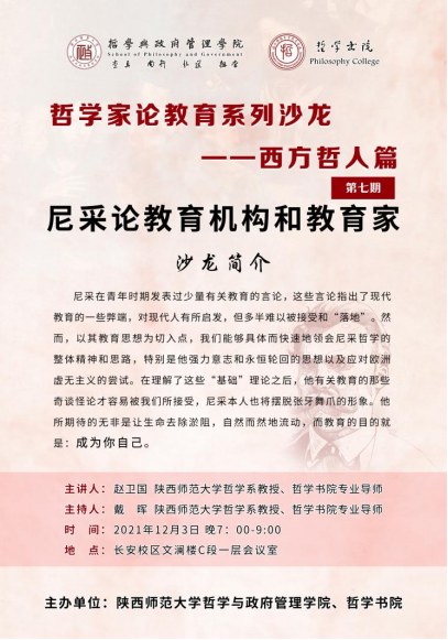 尼采在青年时期发表过少量有关教育的言论,这些言论指出了现代教育的一些弊端,对现代人有所启发,但多半难以被接受和“落地”。然而,以其教育思想为切入点,我们能够具体而快速地领会尼采哲学的整体精神和思路,特别是他强力意志和永恒轮回的思想以及应对欧洲虚无主义的尝试。在理解了这些“基础”理论之后,他有关教育的那些奇谈怪论才容易被我们所接受,尼采本人也将摆脱张牙舞爪的形象。他所期待的无非是让生命去除淤阻,自然而然地流动,而教育的目的就是:成为你自己。