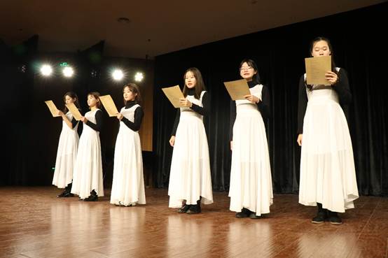 值得一提的是,本剧在传统话剧的对话表现之外,还将歌队和以“洞喻”为题材的舞蹈穿插其间。歌队是古希腊戏剧中特殊而又不可忽视的角色,它被亚里士多德列为悲剧六要素之一,主要作用为转换戏剧场面、引领剧情、引导观众感情等。本次排演亦遵照古希腊三大悲剧家之作品典范,敬奉亚里士多德之《诗术》教导,将歌队简化为朗诵形式予以呈现,朗诵内容化用、改编自阿里斯托芬、柏拉图、色诺芬、第欧根尼·拉尔修、席勒、歌德、荷尔德林、黑格尔、布克哈特、尼采、海德格尔等哲人、诗人的诸文本。同学们在充满神性和哲思的古典作品中感受到“人类此在在其根基上就是诗意的”,以及与先哲共同思考的震颤。