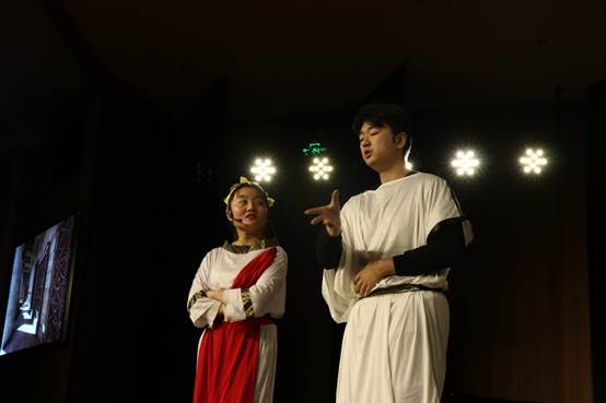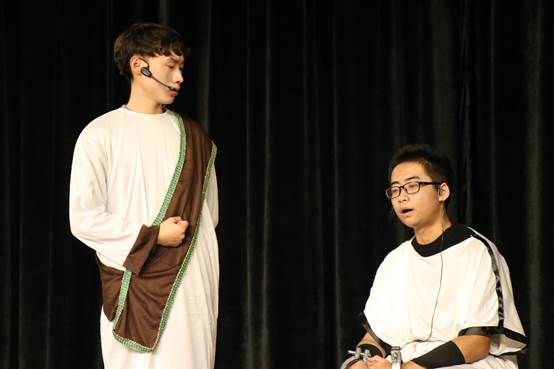 戏剧开场将我们带回到公元前388年,斐多和厄刻克拉特斯重游雅典,两人曾因共同尊敬的苏格拉底产生交集,又在分别多年后于雅典城外偶然相遇,他们回忆起在公元前399年雅典民主派精英以不敬神灵与腐化青年的罪名,将哲人苏格拉底告上法庭的那次事件。话剧第一场《游叙弗伦》,呈现的正是苏格拉底上法庭准备受审前的场景,那日,他恰巧遇到名震一时的预言家游叙弗伦。于是,苏格拉底就“虔敬于神”“怠慢于神”的问题向游叙弗伦请教,可在几次错谬之后游叙弗伦却狼狈逃离开去。简洁的论辩与两位同学生动的表演引起现场观众阵阵笑声,欢乐的气氛中也包蕴着苏格拉底“知识助产术”的高妙智慧。
