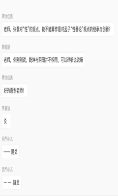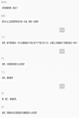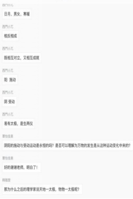 窦老师从乾坤父母、吾体吾性、民胞物与、存顺没宁四个角度对《西铭》逻辑结构和内容进行分析,带领同学们体会张载哲学思想中恢弘壮阔的宇宙精神和民胞物与的济世情怀。同时,窦老师补充了乾、坤二者的关系,“天地之性”与“气质之性”之分,民胞物与的泛爱与儒家等差之爱之间的关系等问题,便于同学们理解宏大抽象的宇宙精神。