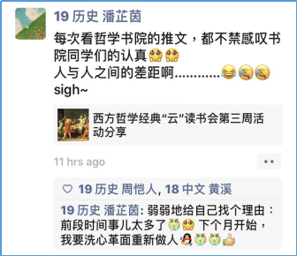 本次读书会选取的文本,兼顾了经典性、思想性和可读性,在这两部篇幅不长的著作中,几乎可以看到哲学与政治、道德与法律、意见与真理、自由与民主、自我与社会、服从与反抗等道德和政治领域的所有问题,同学们将通过文本的深入分析,尝试性地形成自己对”苏格拉底之死“这一西方历史最为重要的政治事件的恰当理解。随后书院制定详细的活动方案,组织招募成员,以课程群和学院群为单位共形成11个读书小组。在开读之前,书院强调读书会的规则,要求各小组根据老师指导研读指定内容,保持进度一致。每周每人须提交一篇读书心得,以小组为单位汇总成一篇,在固定时间由老师在线上带领大家共读及讨论,并抽取几个小组的读书心得进行点评,同时每天由一个小组在群里轮值进行交流分享。