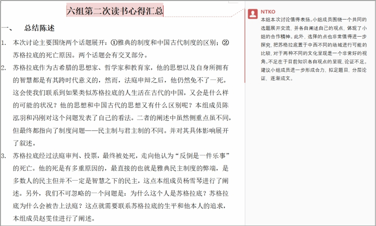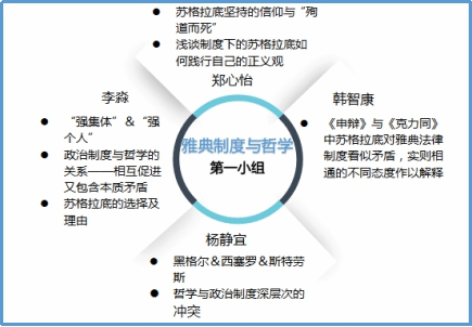 在每日轮值小组的带领下,同学们围绕《申辩》和《克力同章句》提出诸多问题,展开有序的讨论。基于理性的思考和包容的态度,来自不同专业的同学得以对自己的观点进行阐发和辩护,思想碰撞的火花也得以闪烁其光。各小组的阅读心得形式多样、角度各异,在经过审慎思考和仔细求证后对苏格拉底之死引发的一系列问题作出了进一步的回答。概言之,心得主要围绕“死亡”、“真理、“哲学与政治”等几个关键词进行阐述,或将哲学问题放在与政治领域交叉的视域下进行考察,或将苏格拉底与孔子、阿基琉斯等人进行横向比较,内容异彩纷呈,文字与思想交融得以激荡人心。