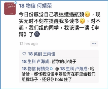 本次读书会别出心裁地采取“共读打榜”的形式,即采用积分制,制定积分榜,各小组成员根据每日分享和提交心得进行打榜,两次以上未能及时提交读书心得的小组将失去共读机会。这种方式不仅有效地激励学生养成每日阅读的习惯,同时营造出互进互助的优良学习氛围。在一月的打榜过程中,各读书小组之间你追我赶,形成一种阅读式PK。而小组内部成员之间也互相勉励,集思广益,分享延伸阅读材料,切磋完善论点,不断充实论据,最后以合集形式呈现出的小组报告则是力图尽善尽美。