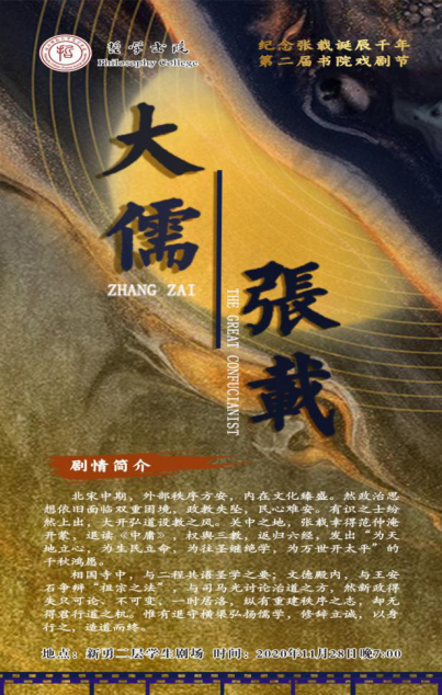 2020年恰逢关学宗师张载诞辰千年,四虎影院 自编自导自演的话剧《大儒张载》于11月28日晚19:00,在四虎影院 新勇二层学生剧场成功公演,四虎影院 通过话剧揭开历史的面纱,回顾先儒生命历程,溯关学遗迹,承先贤之风,以此致敬先贤,致敬传统文化。
