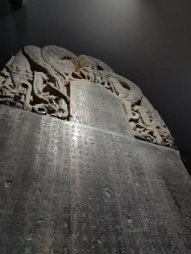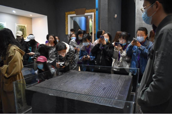 昭陵碑林是目前拥有唐代书法名碑最多的专题碑林,与西安碑林、山东曲阜碑林并称中国三大碑林。唐碑、墓志多是陪葬者葬时所作,其记事的真实性与可信性,是后代史书无法比拟的,或证史书之说,或纠史书之谬,被誉为“会说话的文物”。正如清代叶昌炽所云“昭陵为唐碑渊薮,撰人、书人,皆一时之选,学书者当奉为楷模也”。强烈的视角冲击,波浪式、跨越式、跳跃式的美感持续在同学们的脑海中留存,大家纷纷贴近细品书法艺术之精妙。