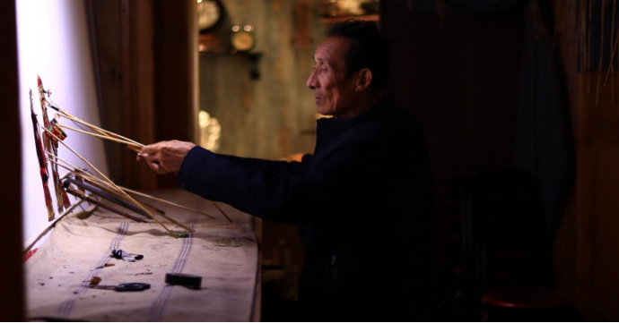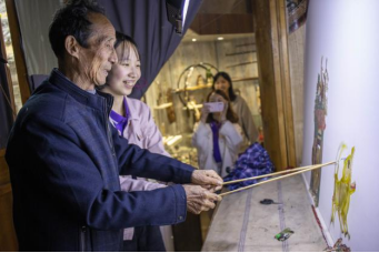 演出结束后,同学们纷纷上前与老艺术家交流请教皮影这一饱含乡土气息的艺术品,并在老人的指导下,尝试操作。