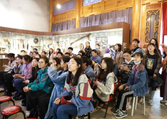 关中皮影是一种非常古老的传统戏剧艺术形式之一。馆内各式各样轮廓清晰、精致缜密、形神兼备的皮影人物、道具同样吸引着每个人。“双手舞动百万兵,一口诉说千古事”,大家在观看《卖货郎》中进一步感受皮影独特的魅力。“顶天立地的渔鼓,降龙伏虎的简板”,白纱屏幕后,老艺术家一边操纵戏曲人物,一边用陕西碗碗腔或弦板腔唱述故事,配以打击乐器和弦乐,有浓厚的秦人气息。各类人物活灵活现,台下掌声连连。