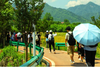 自长安校区出发,驱车大约半小时,师生在翠华山脚处下车远眺便可见蓊郁荫翳的树木与湛蓝辽阔的天空,缥缈的几缕云恰好构成了一幅雅趣盎然的淡墨山水画,正值春末夏初时节,鸟鸣花香,草长莺飞,一片生机勃勃万物竞发的景态。