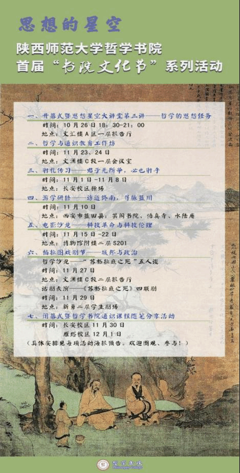 戏剧演绎,沉思先哲。第一届“柏拉图戏剧节”以《苏格拉底之死》为剧目,依托古希腊经典,促动学生深入到古希腊哲学的当下,体味古典生活之秩序与指向,沉思先哲行动之意义与标示。第二届“书院戏剧节”以《大儒张载》为剧目,通过戏剧揭开历史的面纱,回顾先儒生命历程,溯关学遗迹,承先贤之风。恰逢张载千年诞辰,四虎影院