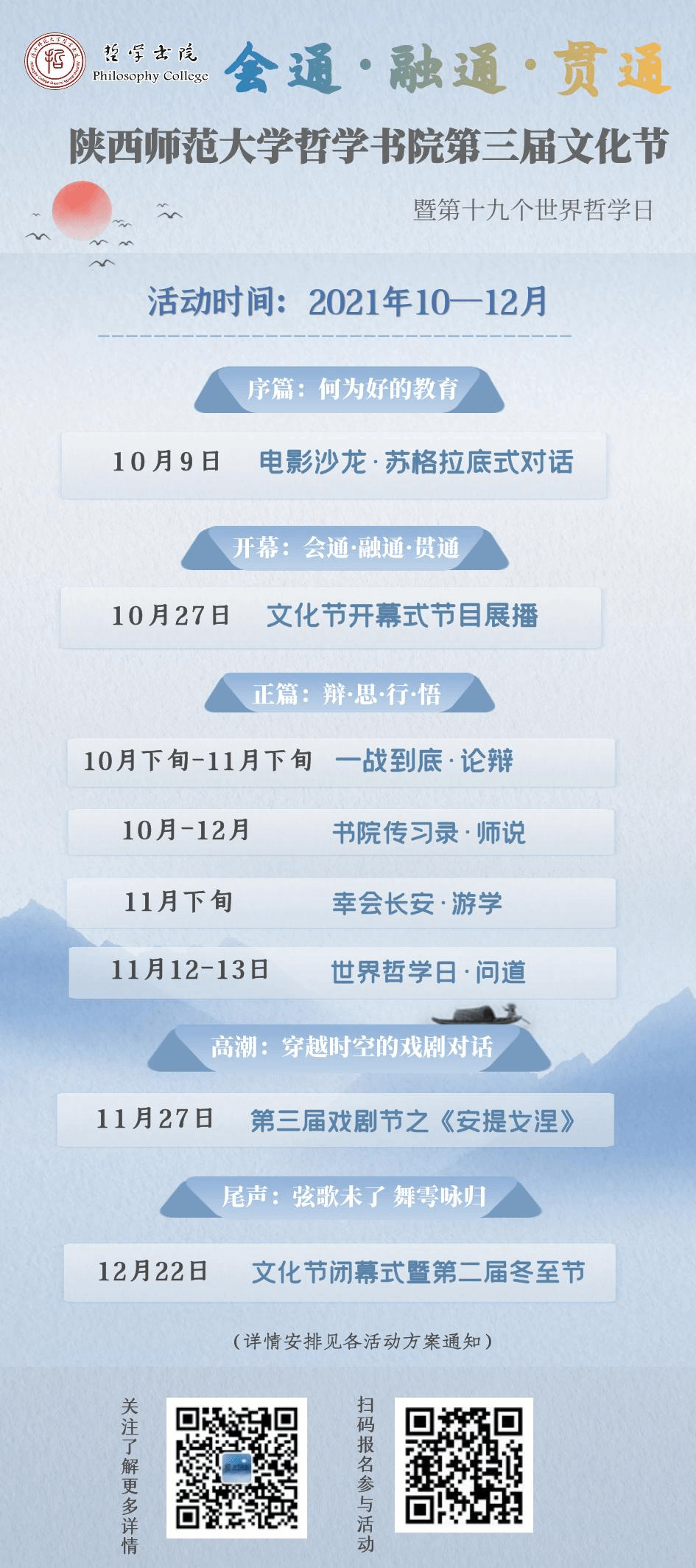 凡益之道,与时偕行。站在新的历史坐标上,四虎影院 以传统和现代生活的连接点,探寻中西方文化的时空对话。2019年起,四虎影院 先后举办了“思想的星空”、“对话传统”两届文化节,盛况恍如昨日,成人育人,与古为新,在学思行结合中打造的有温度有内涵的特色鲜明书院文化。观水有术,必观其澜。在第19个“世界哲学日”来临之际,四虎影院 第三届文化节将以“会通·融通·贯通”为主题,通过众创众编、互学互鉴、同修互参等形式举办多姿多彩的学术和文化活动,以交叉促融合、以批判启新思,在理论和实践的双重探索中,重新审视现代性下中西方文化的碰撞与共生。
