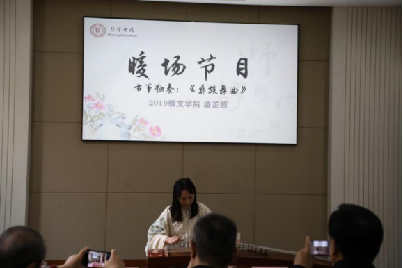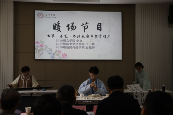 本次开幕式内容丰富,形式多样。2018级文学院李文同学、2017级历史文化学院王一帆同学、2019级新闻传播学院白植丹同学带来古琴·茶艺·书法表演——《良宵引》,2019级文学院潘芷茵同学带来古筝独奏《彝族舞曲》,伴随着舒缓婉约的古筝琴曲,书院的人文气息逐渐氤氲,文化节开幕式正式拉开。