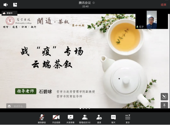 茶叙活动很快就进入尾声,即使是线上云交流,每位同学仍热情不减,意犹未尽。最后,石碧球老师做了总结。他认为,做哲学就是面对一个永恒的哲学问题,我们用一种合乎逻辑的方式去论证,最终能够说服对方,说服自己。