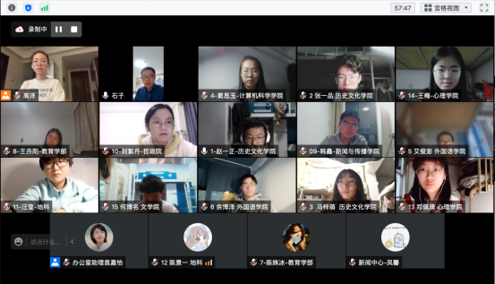 “闻道·茶叙”第十四期借助腾讯会议平台顺利开展。本期是首次以线上形式开展的茶叙活动,也是在疫情防控时期的一场特殊茶叙,主题围绕书院生活和疫情下的情绪舒缓,从“心”出发,温暖疫情下的寒冬。本期茶叙由书院常驻导师石碧球参与指导,来自9个学院多个专业的15位同学共同参与。办公室高洋老师担任主持。