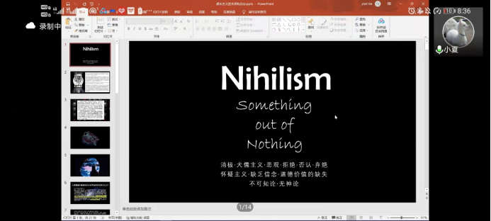最后,陈钰涵同学为人们展示了马尔克斯在《百年孤独》中呈现出的虚无主义色彩以及尼采,叔本华关于虚无主义的经典名言等。